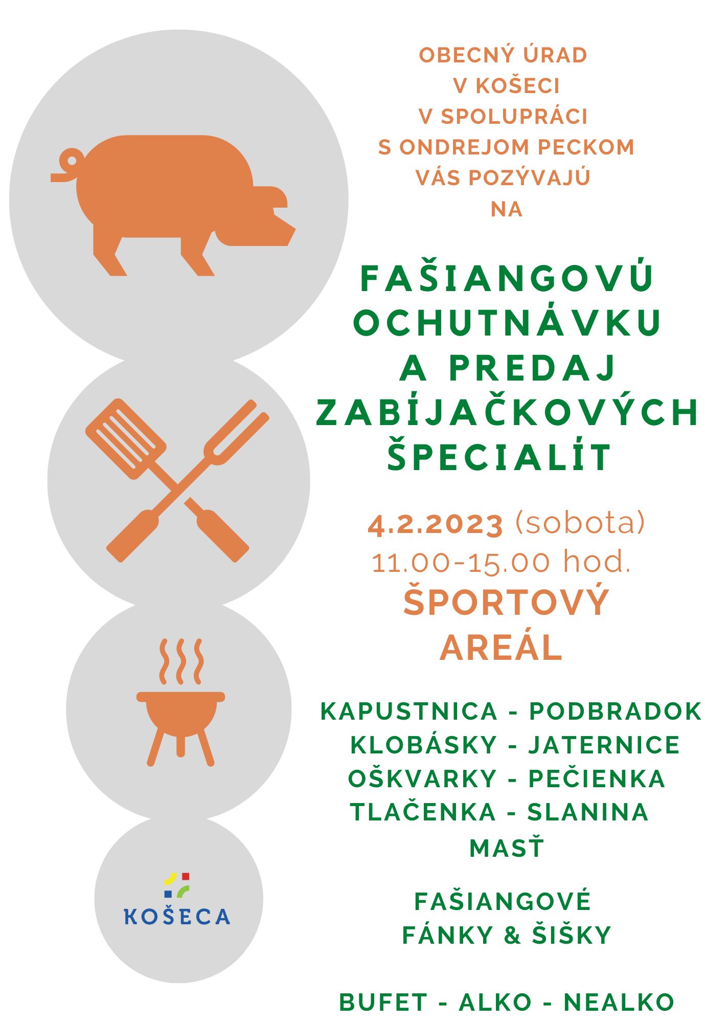 Pozývame Vás na ochutnávku a predaj zabíjačkových špecialít dňa 4. 2. 2023 do priestorov športového areálu v Košeci.