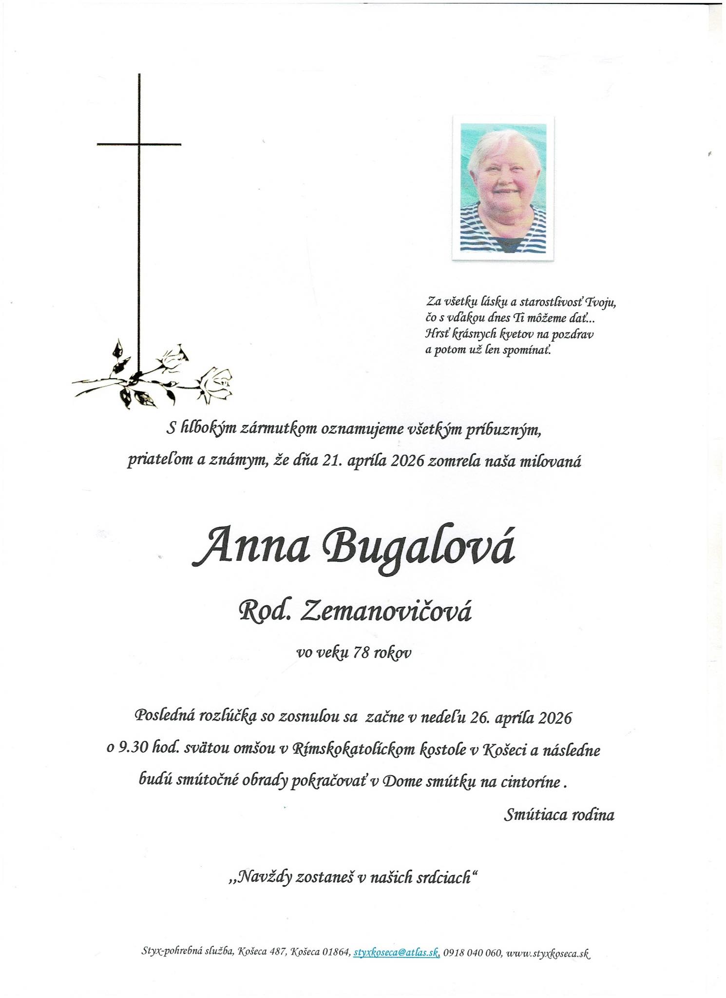 S hlbokým zármutkom oznamujeme všetkým príbuzným, priateľom a známym, že dňa 21. apríla 2026 vo veku 78 rokov zomrela naša občianka p. Anna Bugalová, rod. Zemanovičová. Posledná rozlúčka so zosnulou sa začne v nedeľu 26. apríla 2026 o 09,30 hodine svätou omšou v Rímskokatolíckom kostole v Košeci a následne budú smútočné obrady pokračovať v Dome smútku a na miestnom cintoríne.