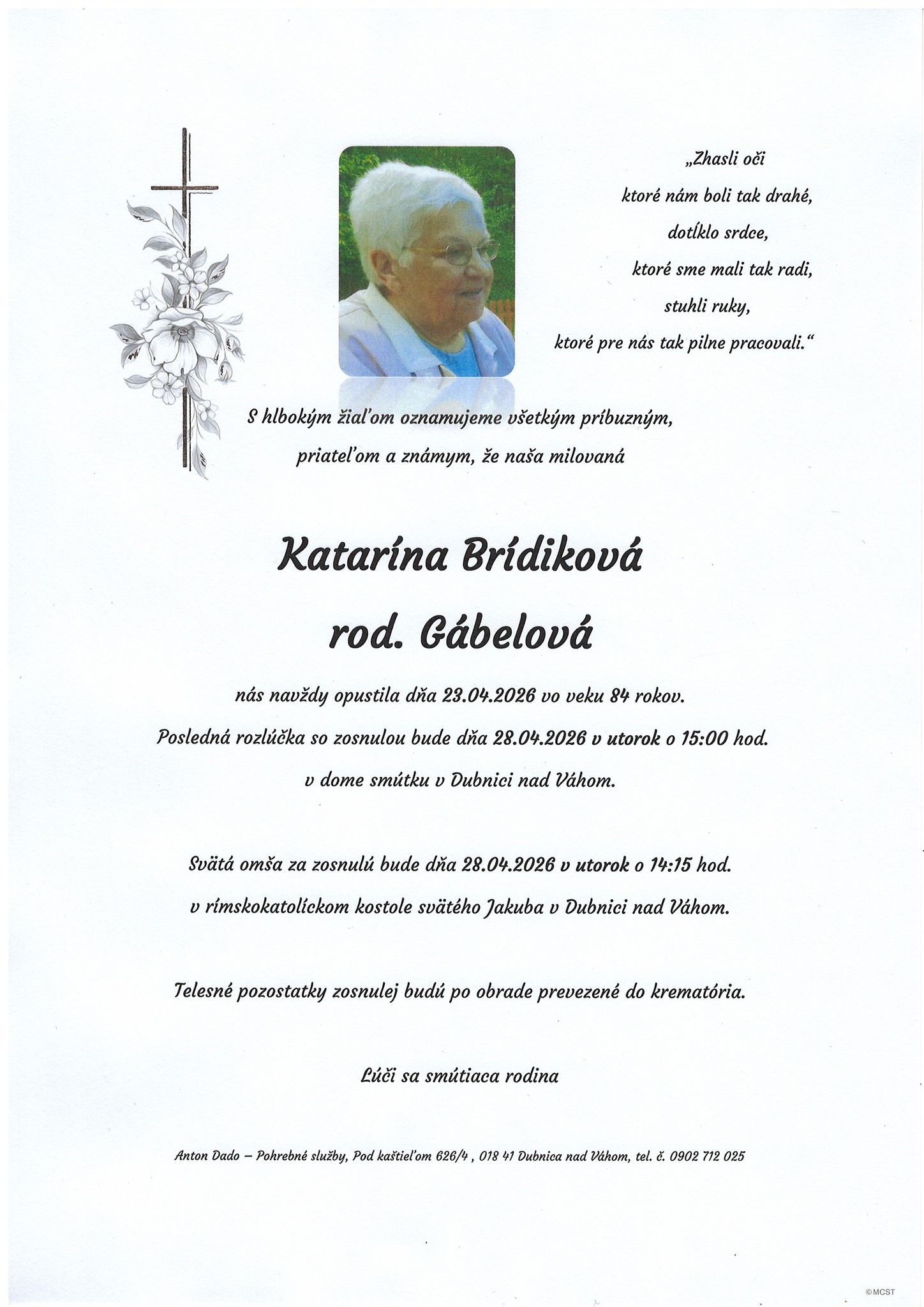 S hlbokým zármutkom oznamujeme všetkým príbuzným, priateľom a známym, že dňa 23. apríla 2026 vo veku 84 rokov zomrela naša bývalá občianka p. Katarína Brídiková, rod. Gábelová. Posledná rozlúčka so zosnulou bude v utorok 28.apríla 2026 o 15:00 hodine v dome smútku v Dubnici nad Váhom.