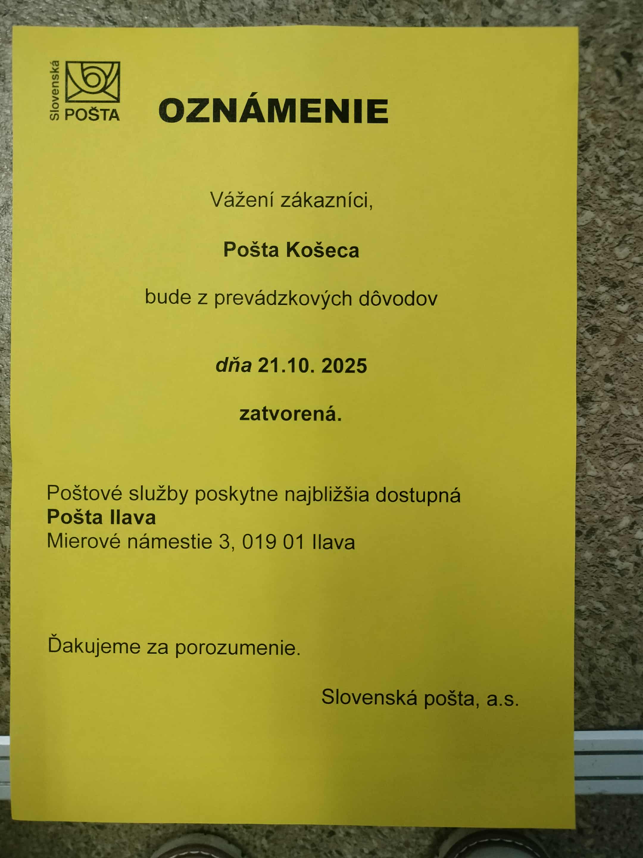 Zmena otváracích hodín - Slovenská pošta Košeca